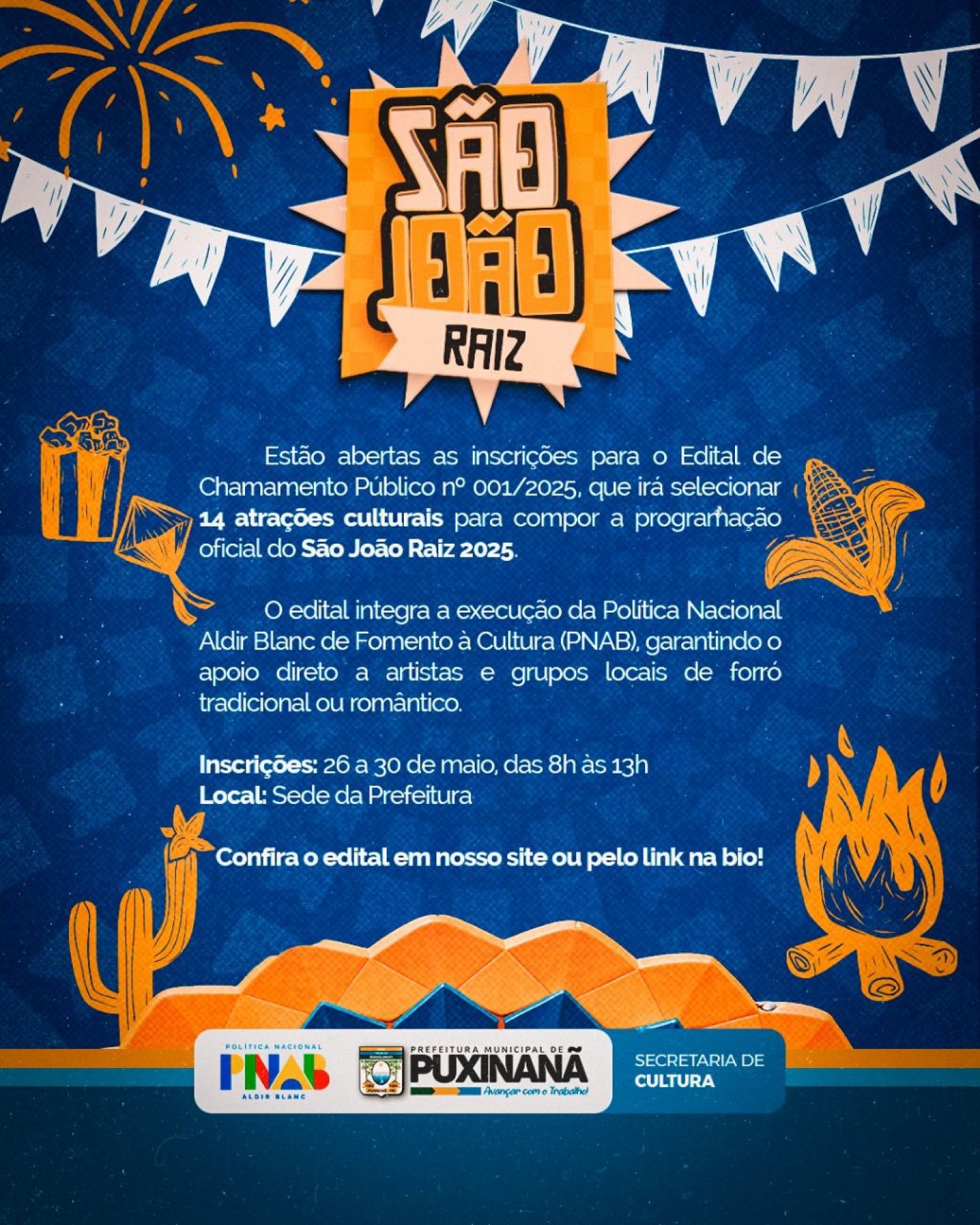 A partir desta segunda-feira estão abertas as inscrições para o Edital de Chamamento Público n° 0001/2025, que será responsável por selecionar 14 atrações culturais para compor a programação oficial do São João Raiz 2025.