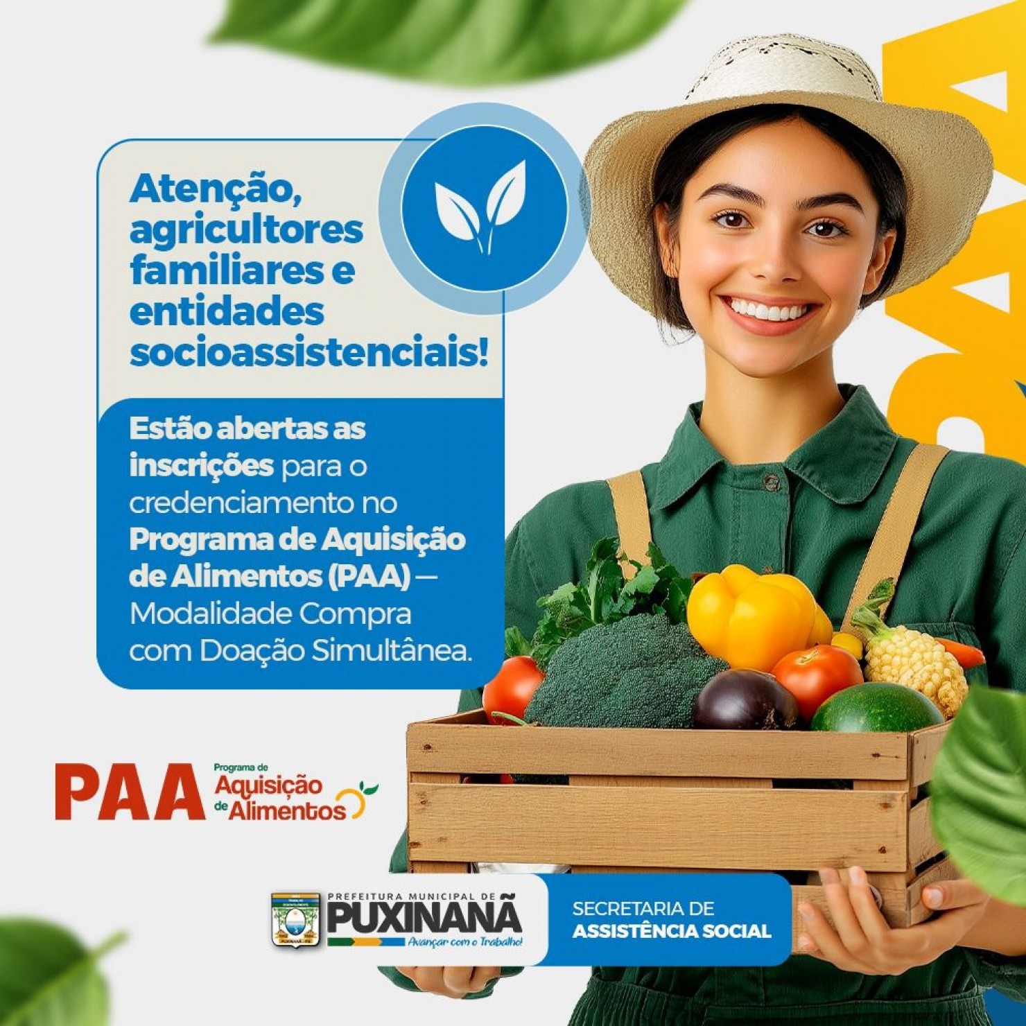 A Prefeitura de Puxinanã, por meio da Secretaria de Assistência Social, informa que estão abertas as inscrições para o credenciamento de agricultores familiares e entidades socioassistenciais no Programa de Aquisição de Alimentos (PAA), modalidade Compra com Doação Simultânea.