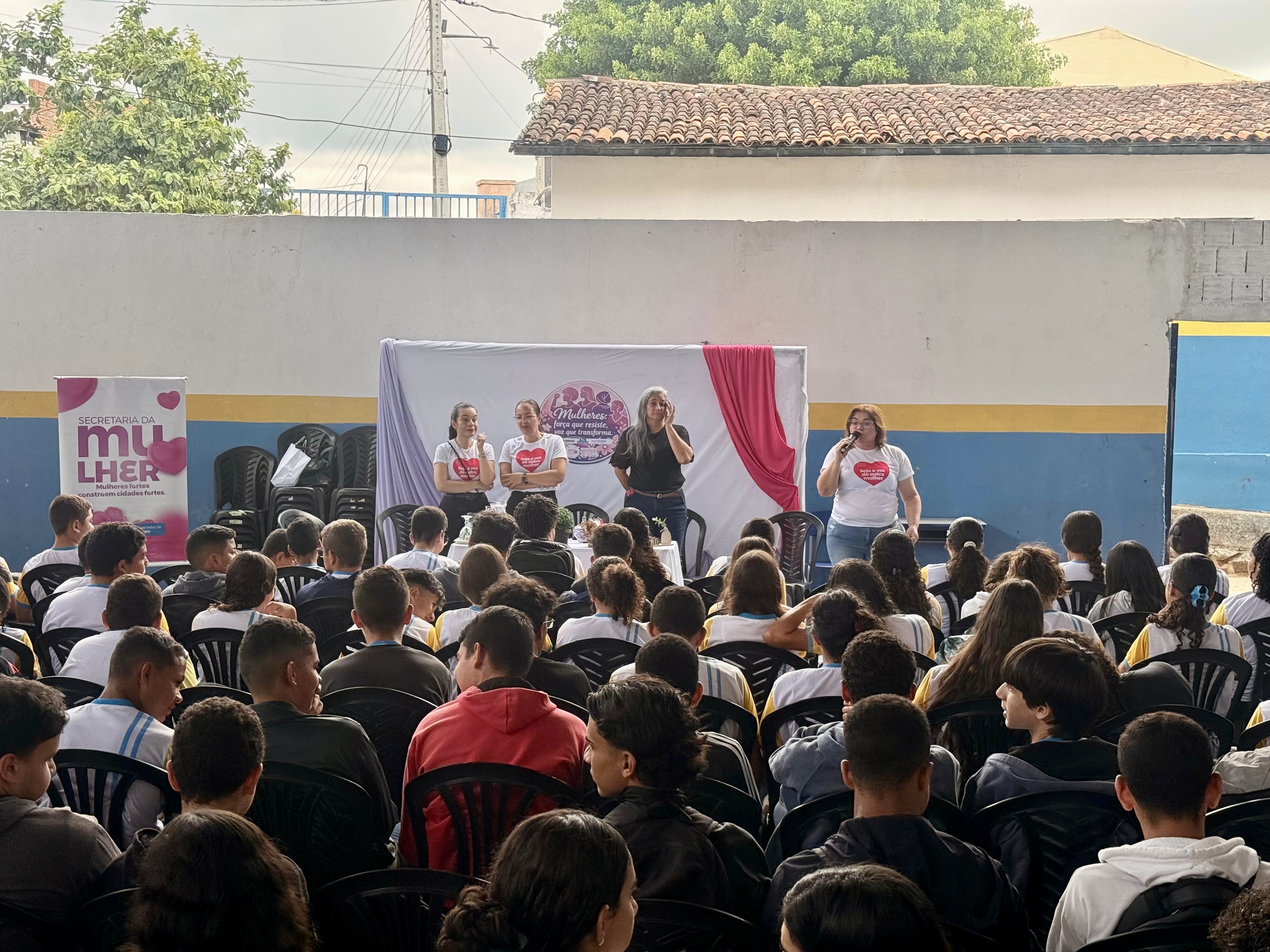 Ainda no período vespertino, o projeto desembarcou na Escola Cícero Gonçalves, ampliando a rede de informação e acolhimento para mais jovens do município. Neste momento, o debate com os alunos contou novamente com a participação da secretária Elisângela Nascimento, que esteve acompanhada pela secretária de Educação, Michele Oliveira, a procuradora-geral do município e presidente do Conselho Municipal da Mulher, Catarine Oliveira, a secretária adjunta de Administração, Marcela Tertulino, e pela advogada Maraísa.