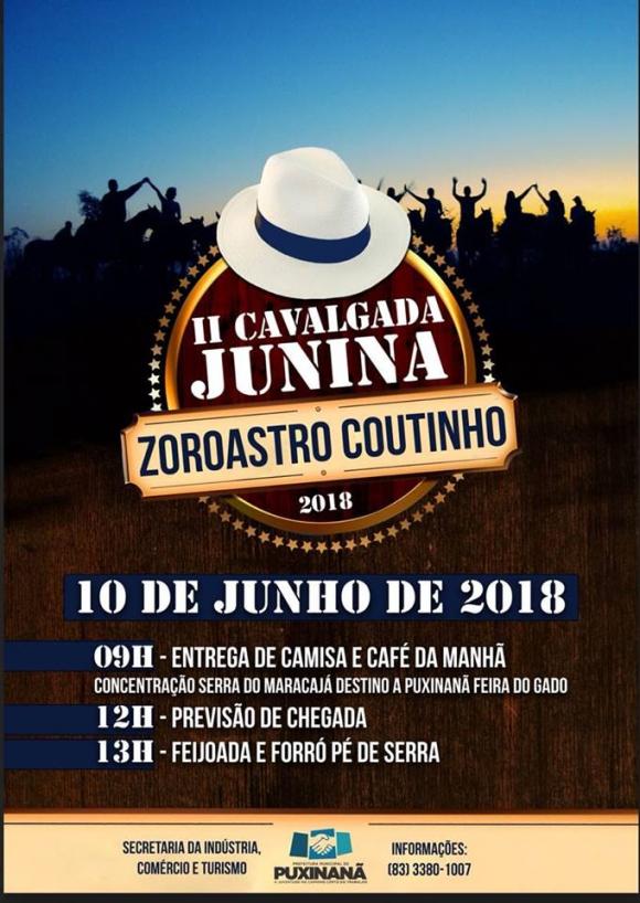 A Prefeitura Municipal de Puxinanã, através da Secretaria de Comercio, Industria, e Turismo, estará realizando á 2ª Cavalgada Junina Zoroastro Coutinho, no domingo 10 de junho de 2018 em Puxinanã.