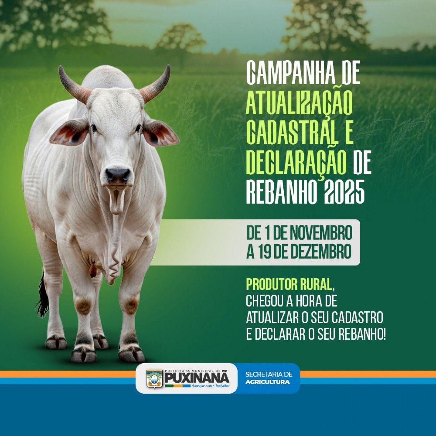 A Prefeitura de Puxinanã, por meio da Secretaria de Agricultura, informa que a Campanha de Atualização Cadastral e Declaração de Rebanho 2025 se inicia em 1º de novembro e segue até o 19 de dezembro.