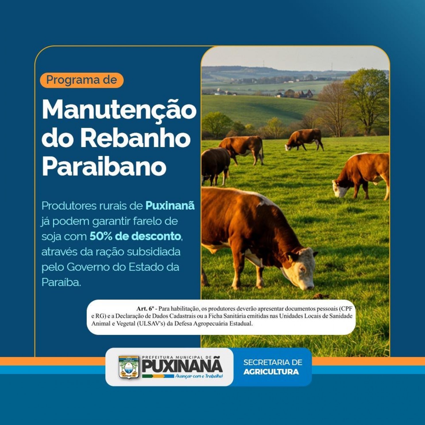 A Prefeitura, por meio da Secretaria de Agricultura, está apoiando o Programa de Manutenção do Rebanho Paraibano, que subsidia a compra de ração oferecida pelo Governo do Estado da Paraíba, com o objetivo de garantir apoio direto à manutenção dos rebanhos durante períodos de estiagem e outras dificuldades climáticas.
