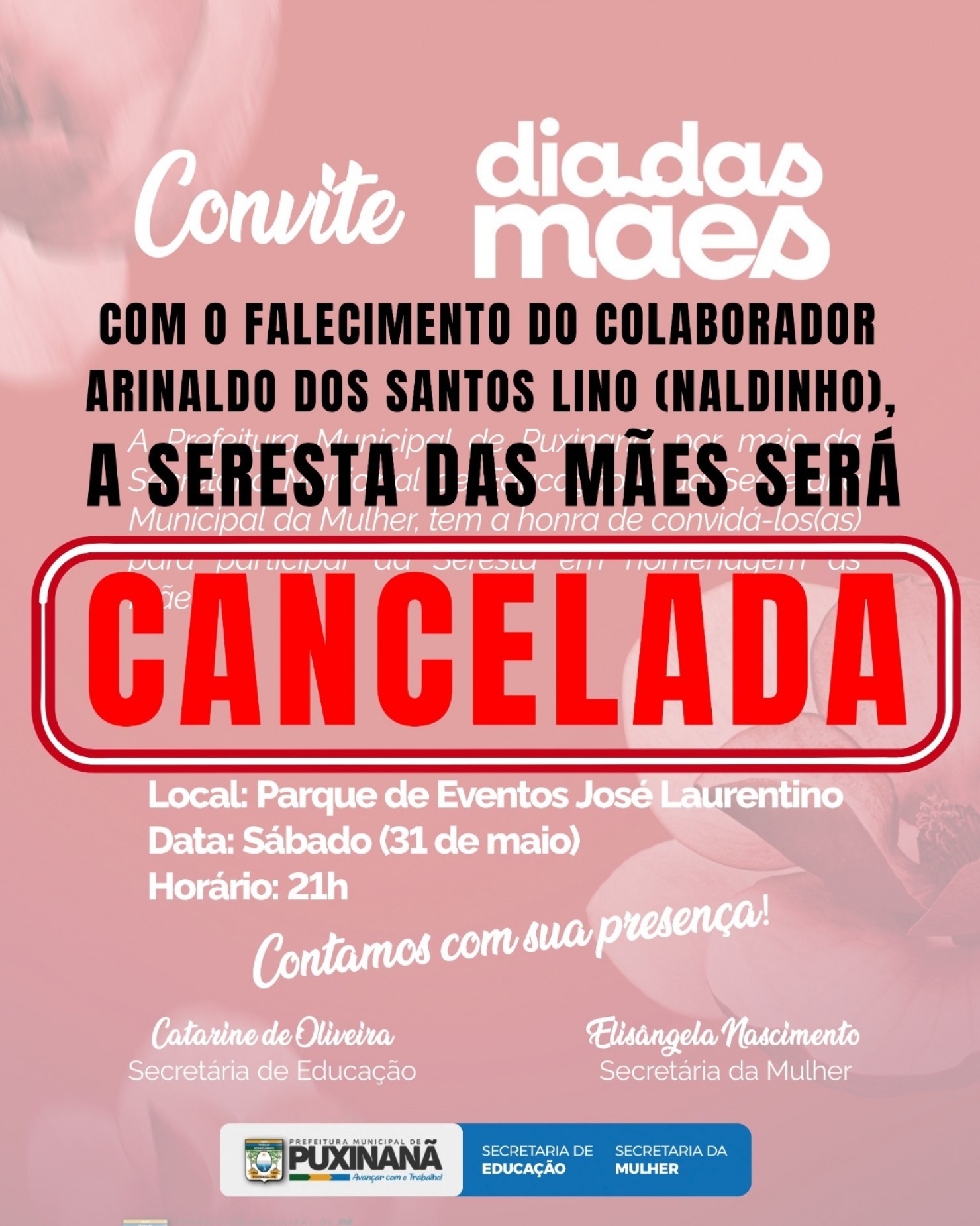 A Prefeitura Municipal de Puxinanã informa que a Seresta das Mães, que seria realizada na noite deste sábado, 31 de maio, está cancelada. A decisão foi tomada em respeito ao falecimento do servidor Arinaldo dos Santos Lino, ocorrido na manhã de hoje.