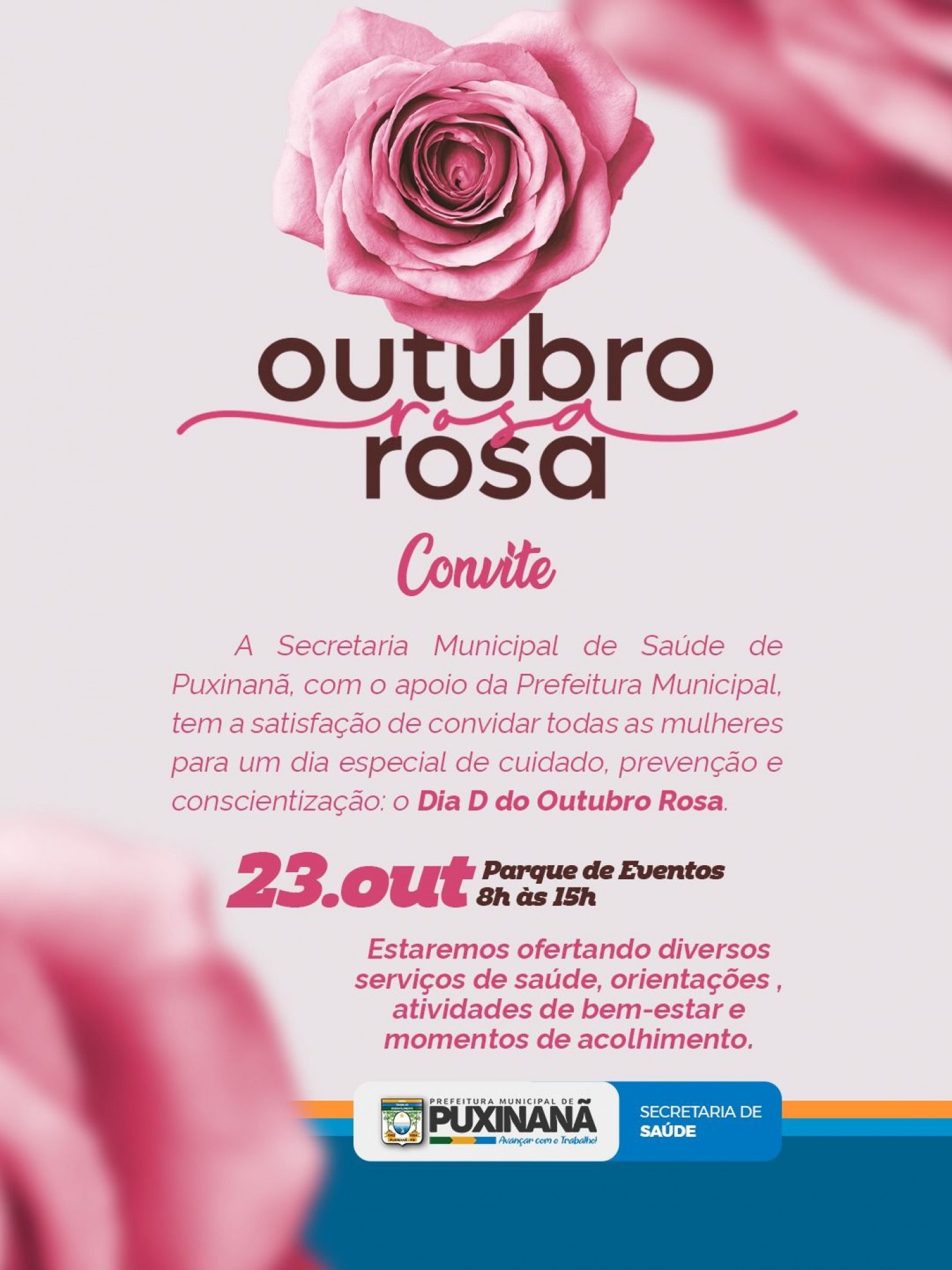 A Prefeitura de Puxinanã, por meio da Secretaria Municipal de Saúde, realizará na quinta-feira, 23 de outubro, o Dia D do Outubro Rosa, com uma programação especial voltada à prevenção, cuidado e conscientização sobre a saúde da mulher.
