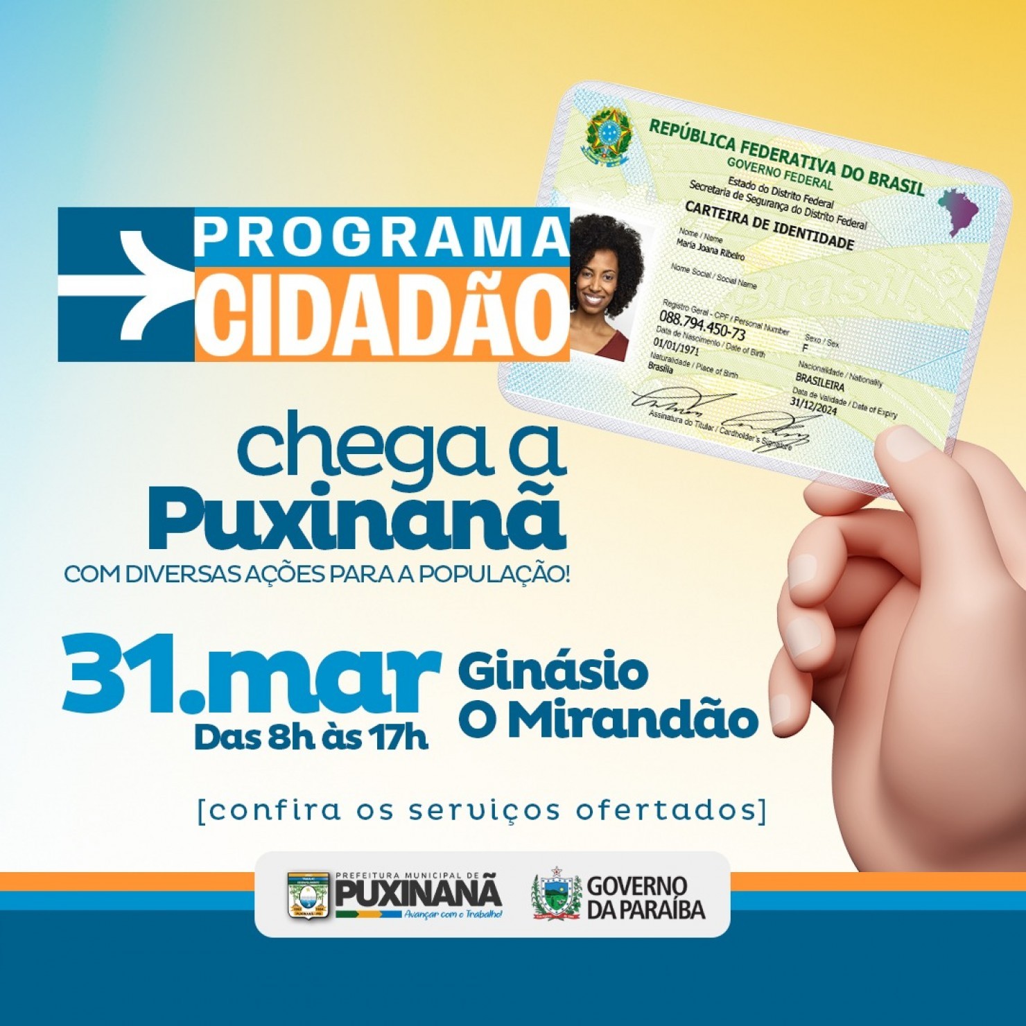 A população de Puxinanã terá acesso a uma série de serviços gratuitos nesta segunda-feira (31), durante a ação do Programa Cidadão. A iniciativa, realizada pela Prefeitura em parceria com o Governo do Estado da Paraíba, acontecerá no Ginásio O Mirandão, das 8h às 17h.