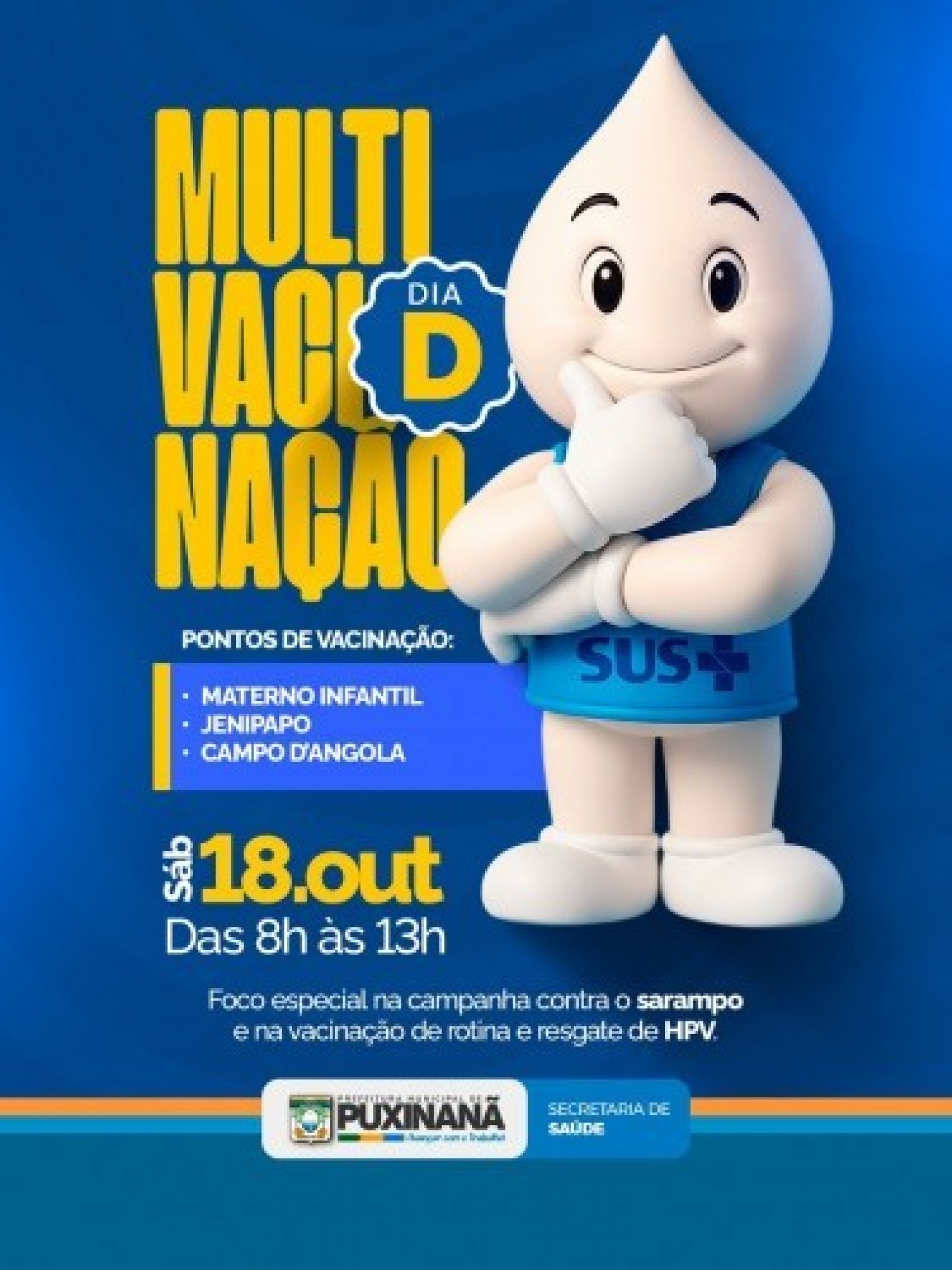 A Prefeitura de Puxinanã, por meio da Secretaria Municipal de Saúde, realiza neste sábado, 18 de outubro, o Dia D de Multivacinação, com atendimento das 8h às 13h.
