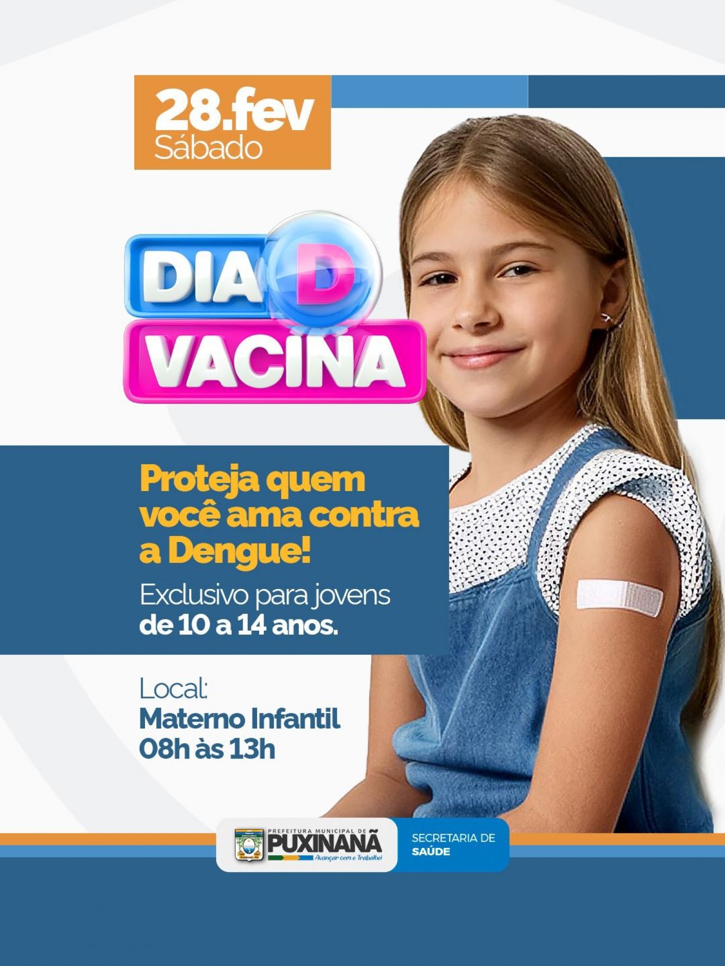 A Prefeitura Municipal de Puxinanã, por meio da Secretaria de Saúde, promove neste sábado (28) o "Dia D" de combate à Dengue, com foco na imunização de crianças e adolescentes. A mobilização é exclusiva para a faixa etária de 10 a 14 anos, grupo prioritário definido pelo Ministério da Saúde.