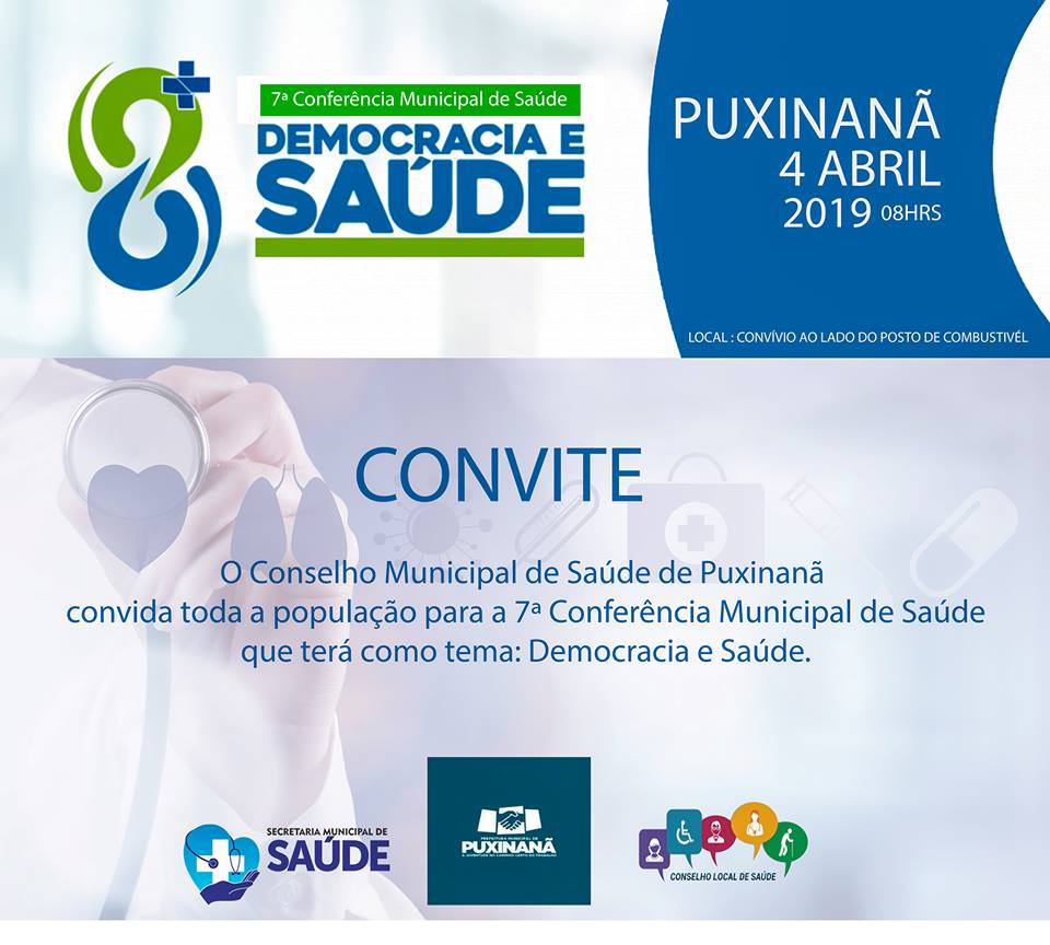 O Conselho Municipal de Saúde de Puxinanã, convida por meio desta toda população Puxinanaense para participarem da 7ª Conferência Municipal de Saúde.