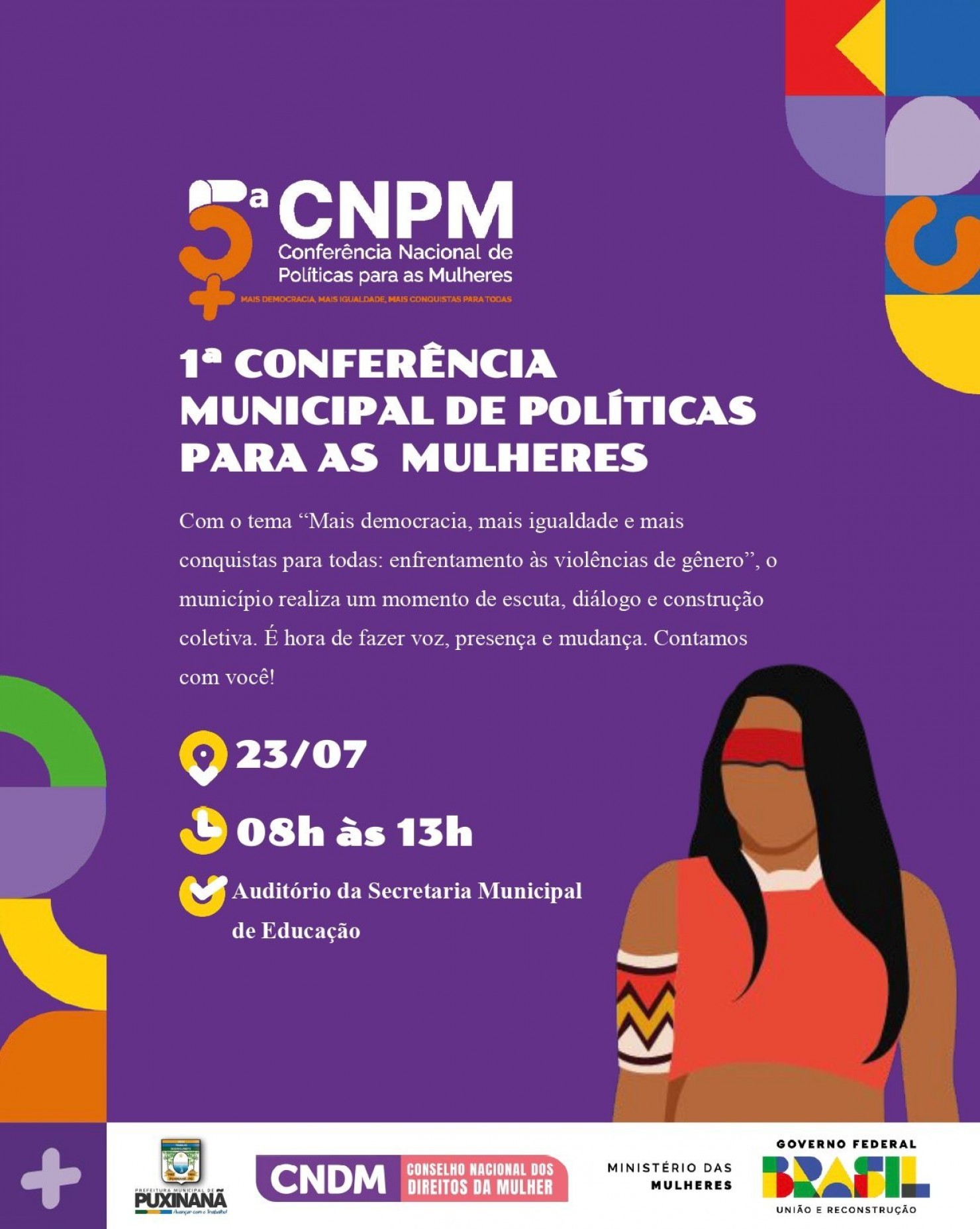 No próximo dia 23 de julho, Puxinanã realiza a 1ª Conferência Municipal de Políticas para as Mulheres, um momento de escuta, diálogo e construção coletiva.
