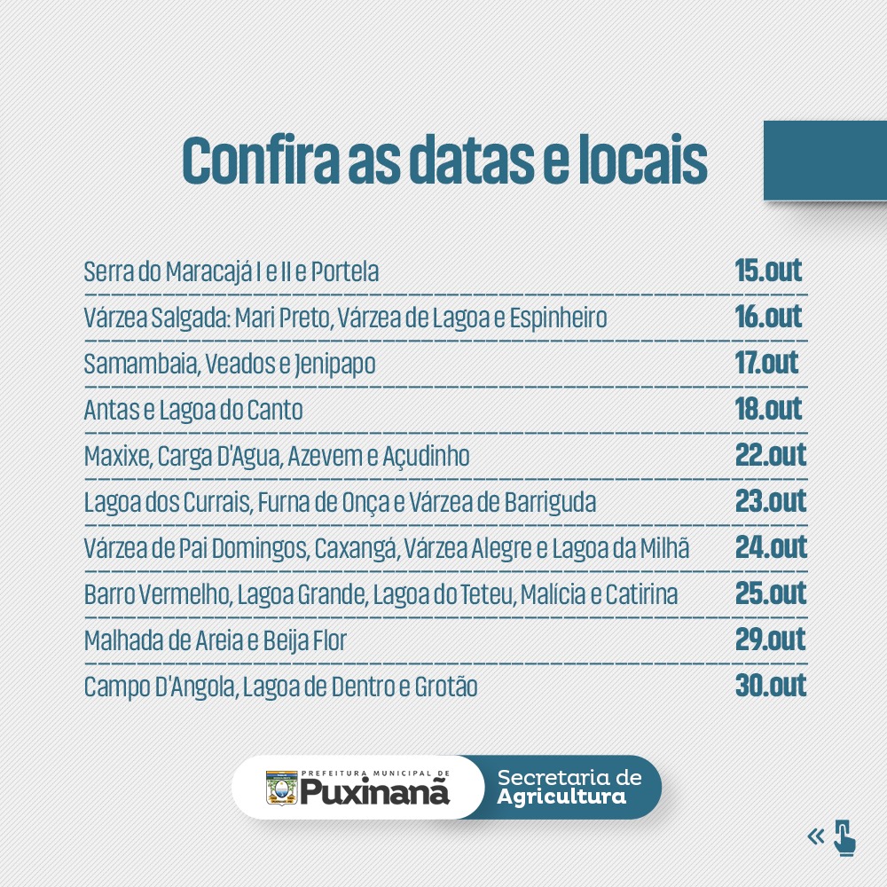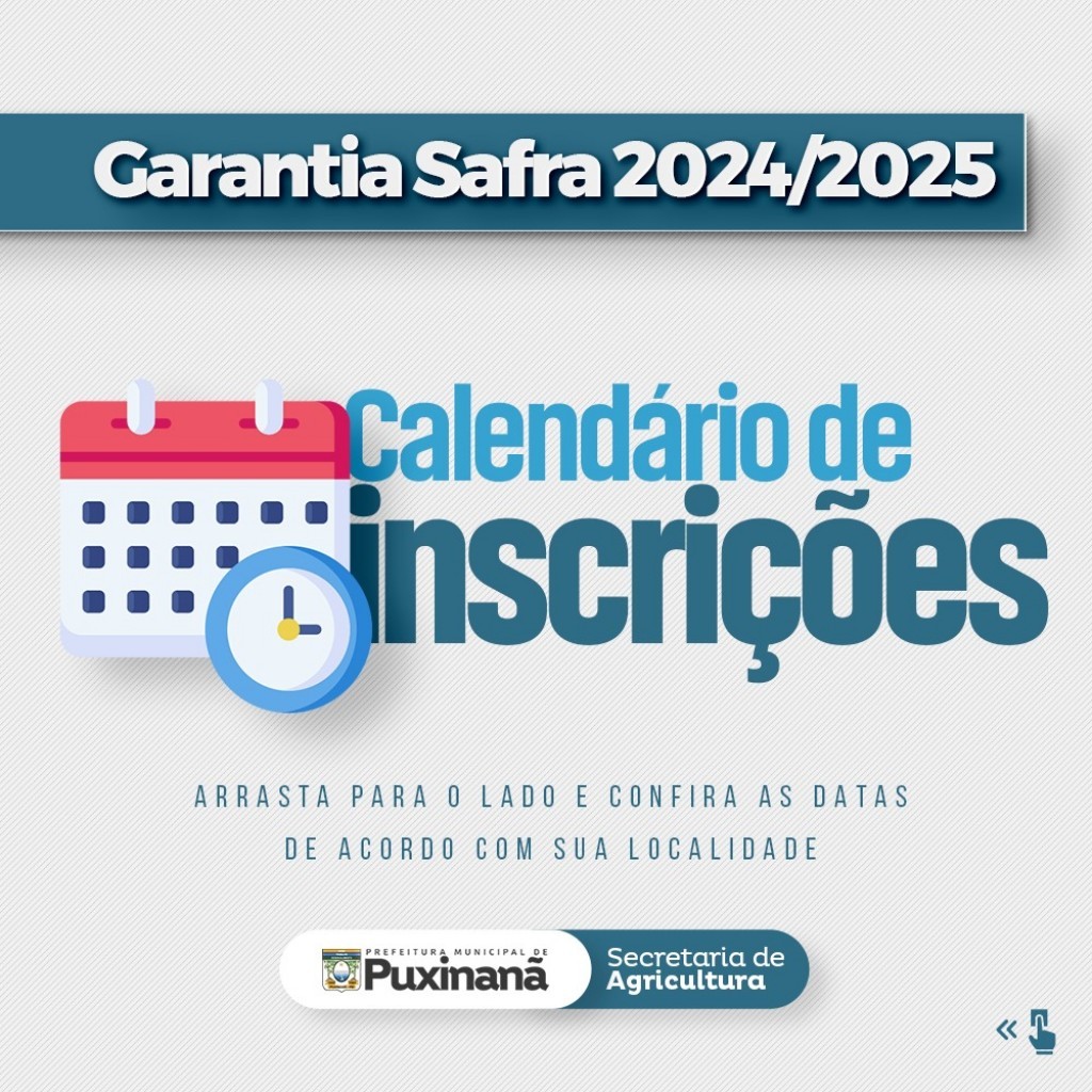 A prefeitura de Puxinanã, em parceria coma Secretaria de Agricultura, iniciou o período de inscrições para o programa Garantia Safra, que oferece um suporte financeiro aos agricultores em caso de seca ou excesso de chuva. As inscrições podem ser realizadas das 08h30 às 11h30, diretamente da sede da  EMPAER no município, as datas são definidas de acordo com a comunidade, confira na imagem abaixo;