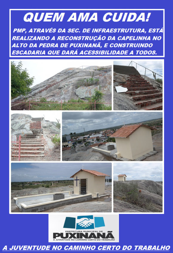A Prefeitura, através da Secretaria de Infraestrutura, continua a reconstrução da Capelinha no alto da pedra de Puxinanã, e pensando em todos aqueles que desejam visitar este lindo ponto turístico de nossa cidade e não conseguem subir até lá, está sendo construída uma escadaria que dará acessibilidade a todos quanto desejarem visitar a Capelinha, e poderem presenciar a belíssima vista do alto do lajedo da Cidade.