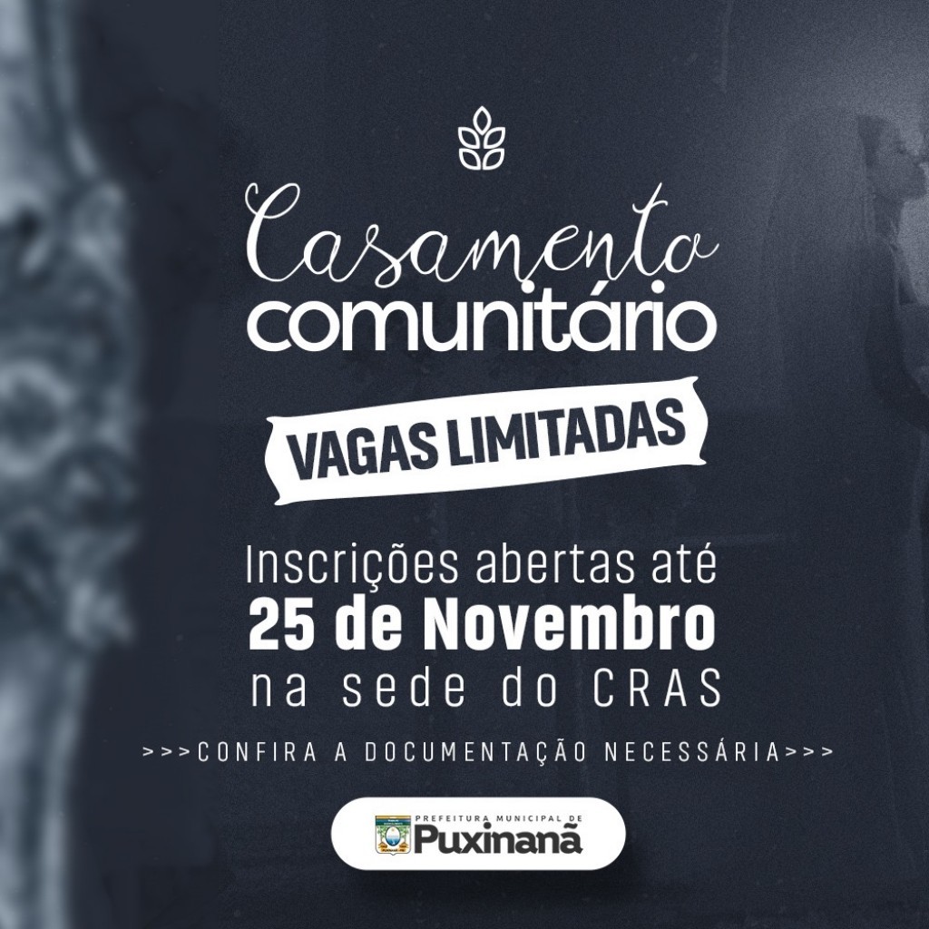 A Prefeitura Municipal de Puxinanã, por meio da Secretaria de Assistência Social, está com inscrições abertas para o Casamento Comunitário, que será realizado em dezembro! Os interessados devem se dirigir ao CRAS, localizado na Rua Rômulo Campos, no centro de Puxinanã, para entregar os documentos exigidos até o dia 25 de novembro de 2024. As vagas são limitadas.