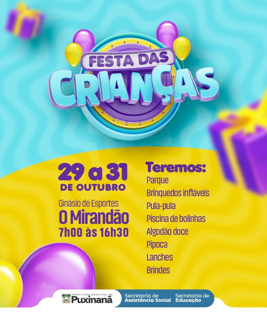 A Prefeitura de Puxinanã, em parceria com as Secretarias de Educação e Assistência Social, promoverá uma festa especial para as crianças nos dias 29, 30 e 31 de outubro. O evento será realizado no Ginásio de Esportes Mirandão, das 7h às 16h30, com uma programação diversificada que inclui brinquedos infláveis, pula-pula, piscina de bolinhas e parques, além de lanches com pipoca, algodão doce e outros quitutes.