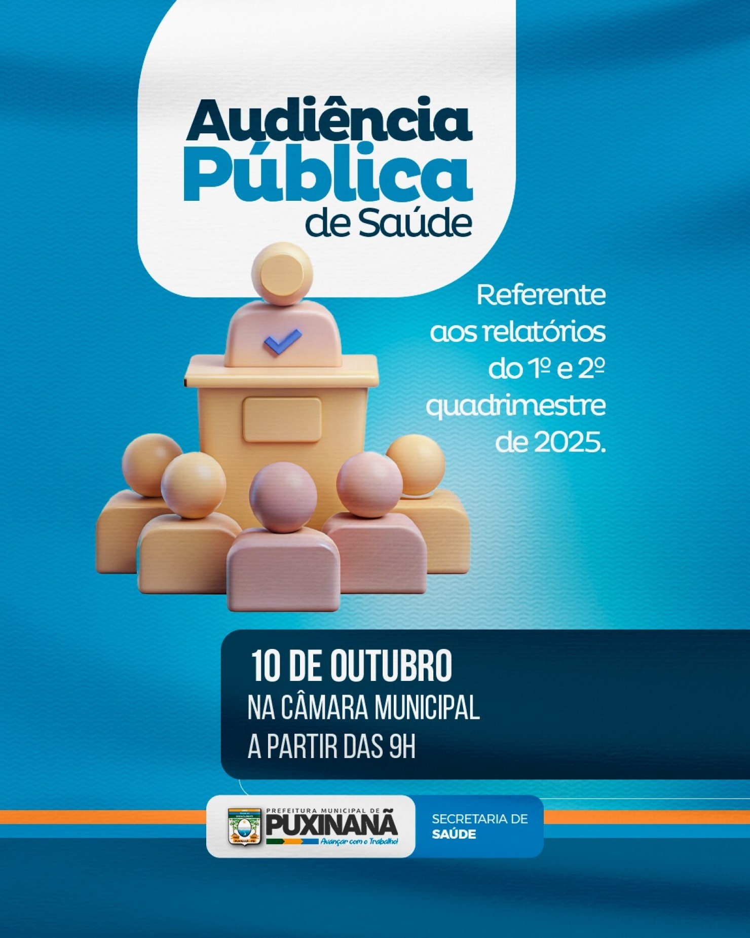 A Prefeitura de Puxinanã, por meio da Secretaria Municipal de Saúde, realizará na próxima sexta-feira, 10 de outubro, a Audiência Pública de Saúde, referente à prestação de contas dos relatórios do 1º e 2º quadrimestre de 2025.
