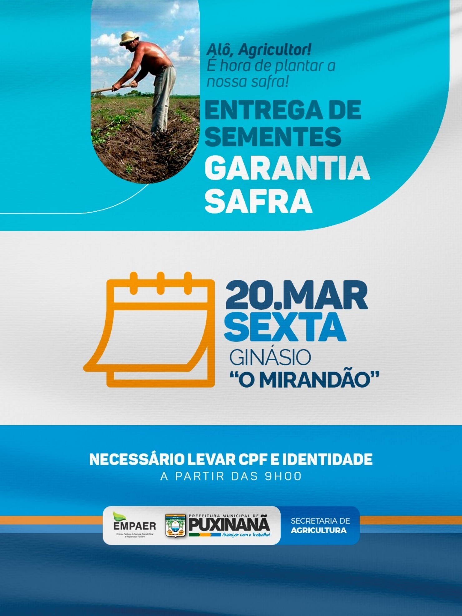 A Prefeitura Municipal de Puxinanã, por intermédio da Secretaria de Agricultura, informa aos agricultores cadastrados que a entrega das sementes referentes ao programa Garantia Safra (2025/2026) ocorrerá nesta sexta-feira, 20 de março.