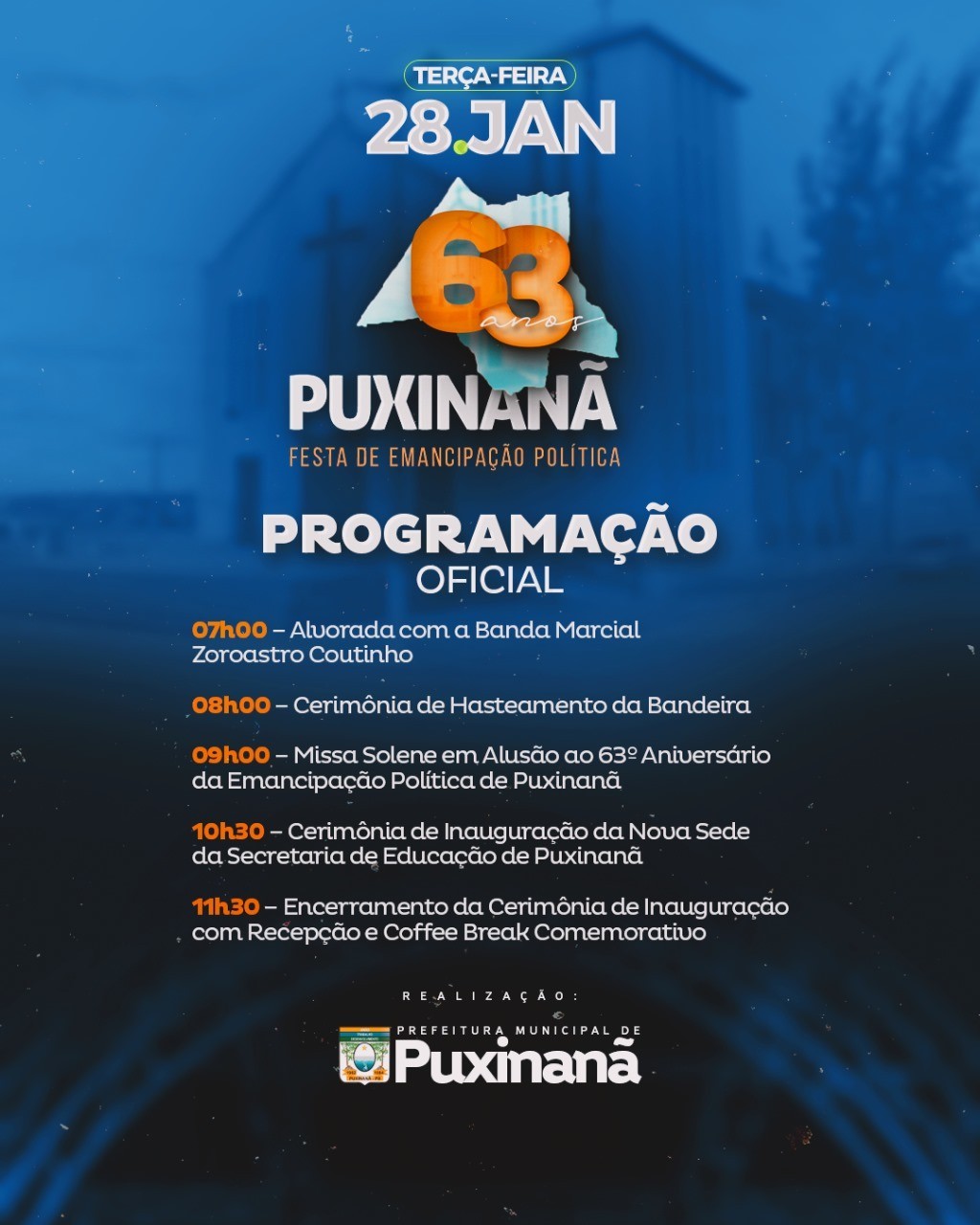 Nessa próxima terça-feira, 28 de janeiro, a Prefeitura Municipal de Puxinanã promove uma programação especial para comemorar o 63º aniversário de emancipação política da cidade. As atividades, que se estendem ao longo da manhã, celebram a história e o progresso do município.