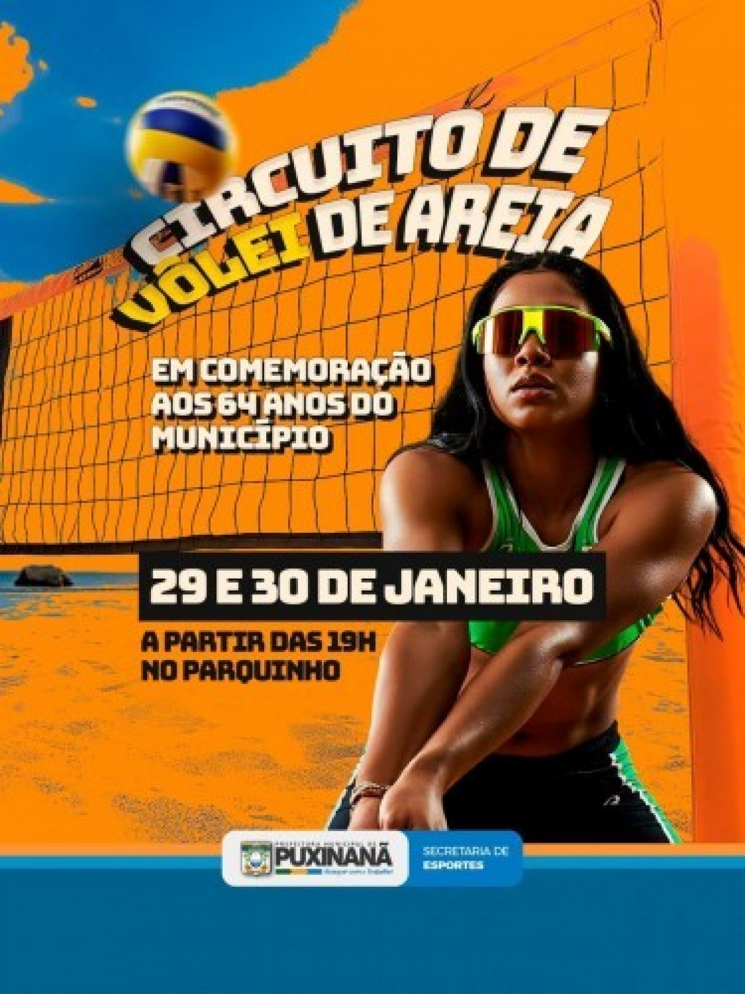 A Prefeitura Municipal de Puxinanã, por meio da Secretaria de Esportes, promove nos dias 29 e 30 de janeiro o Circuito de Vôlei de Areia, evento esportivo que integra a programação comemorativa pelos 64 anos de emancipação política do município.